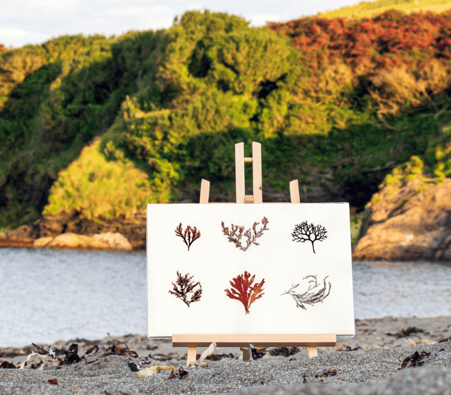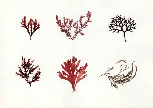 Unframed A5 print of 1.Flat Fern Weed + 2.Red Comb Weed + 3.Irish Moss + 4.Winged Weed + 5.Beautiful Fan Weed and 6.Pitcher Siphon Weed - 1.Osmundea osmunda + 2.Plocamium cartilagineum + 3.Chondrus crispus + 4.Membranoptera alata + Metacallophyllis laciniata + Polysiphonia stricta foraged at Garretstown beach. Printed on sustainable acid free Hahnemühle Hemp paper. Sold unframed only.
